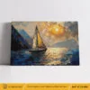 Tableau Voilier Montagnes Bleu et Or – Paysage Marin Impressionniste
