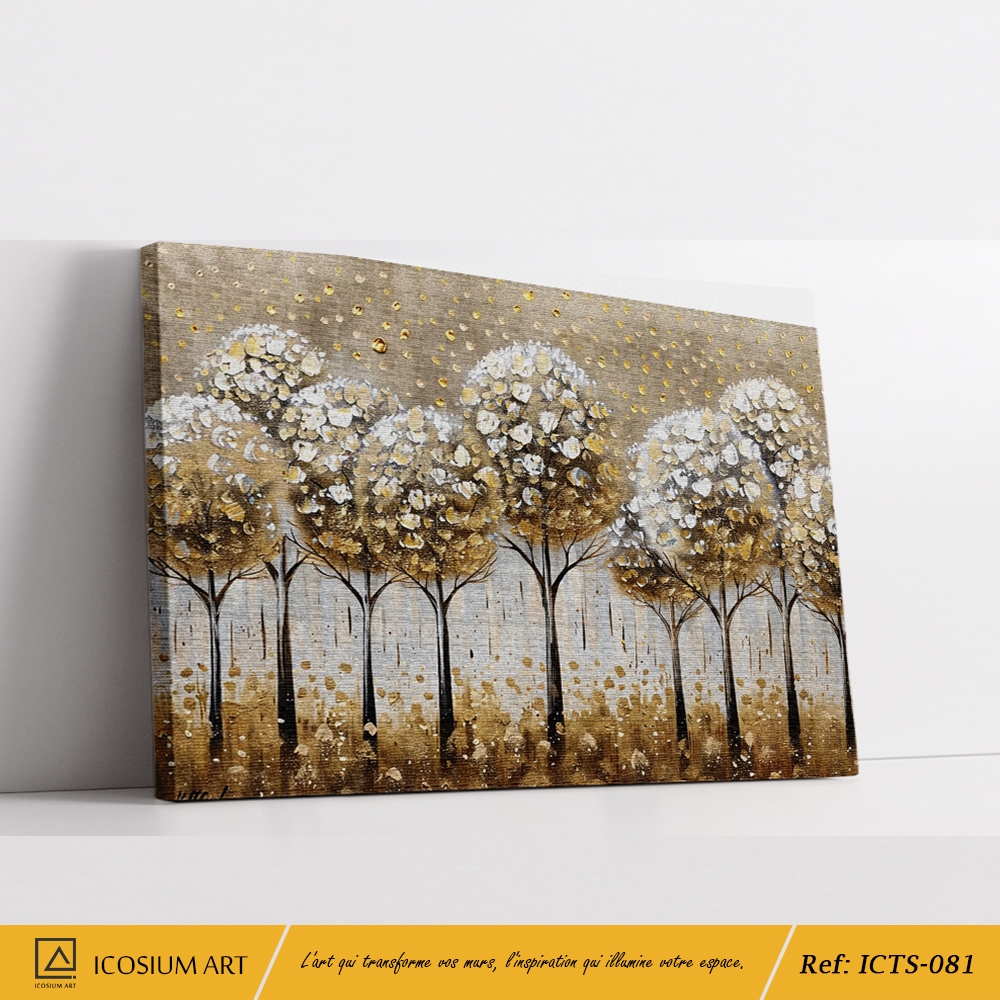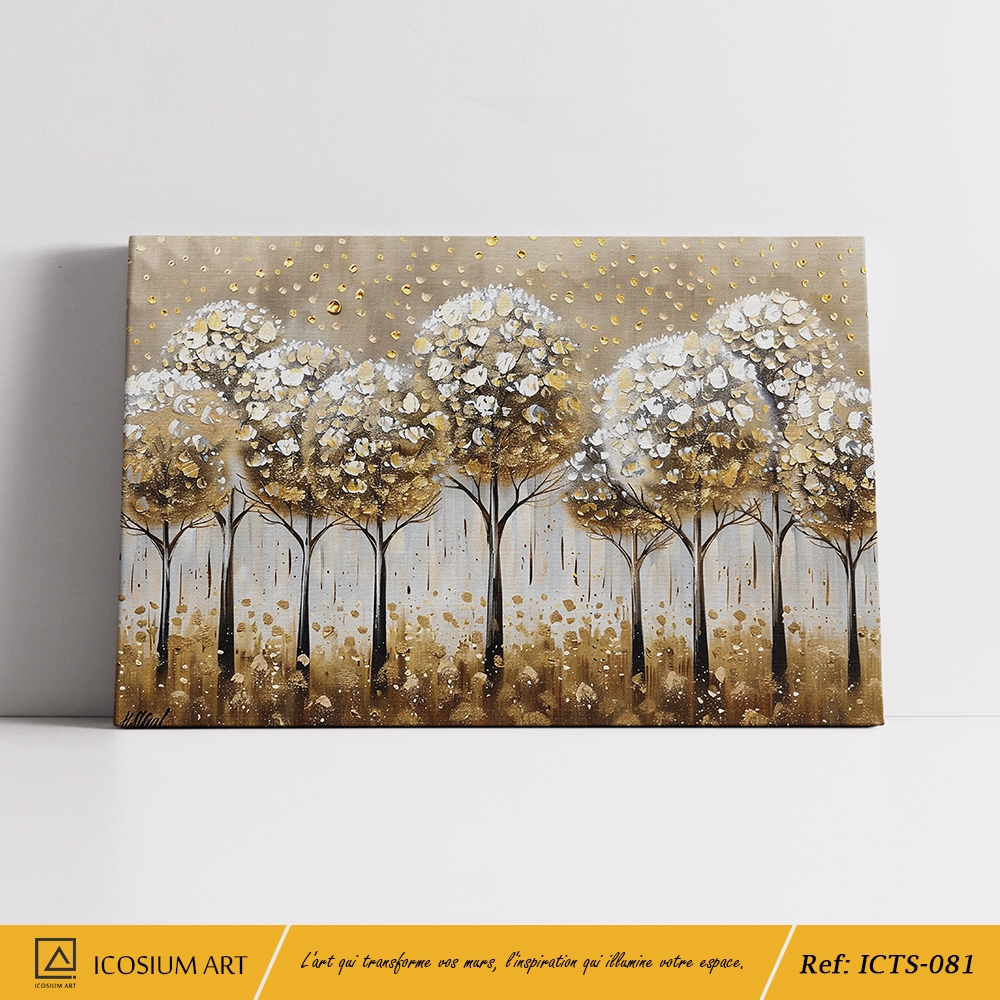 Tableau Arbres Relief 3D Blanc et Or – Forêt Poudrée