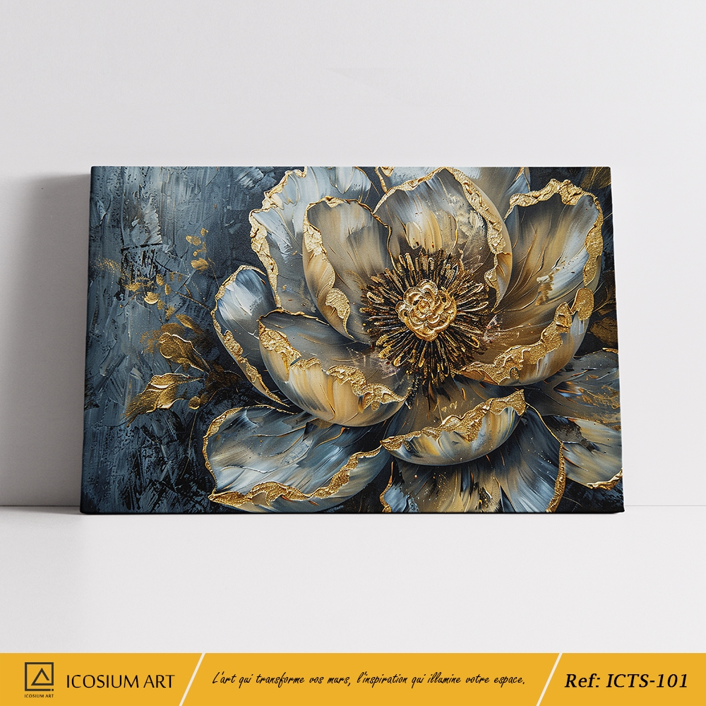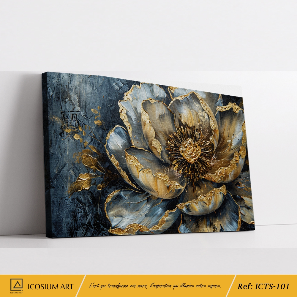 Tableau Fleur Bleu Gris et Or – Effet Relief 3D