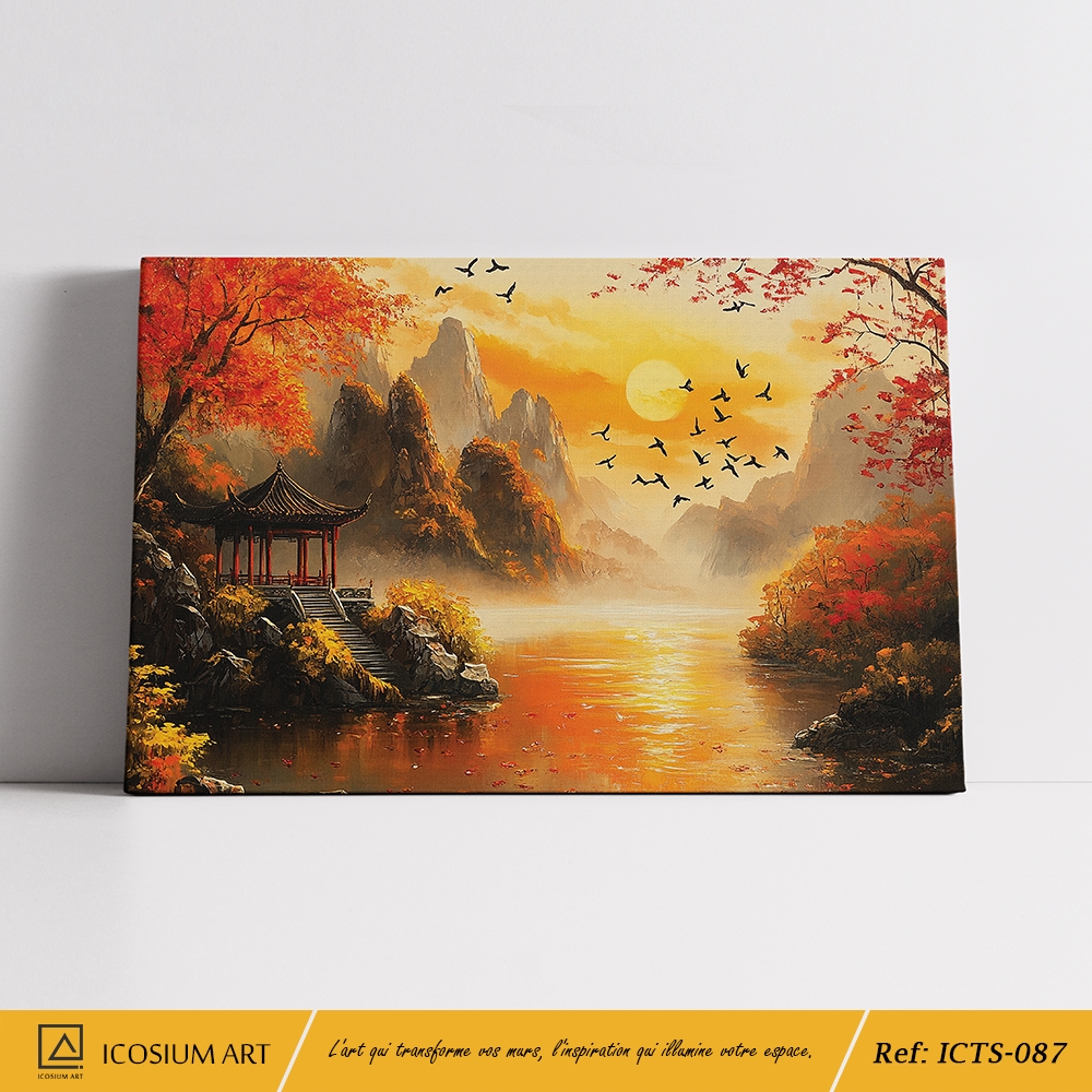 Tableau Paysage Asiatique Temple et Coucher de Soleil – Couleurs Chaudes