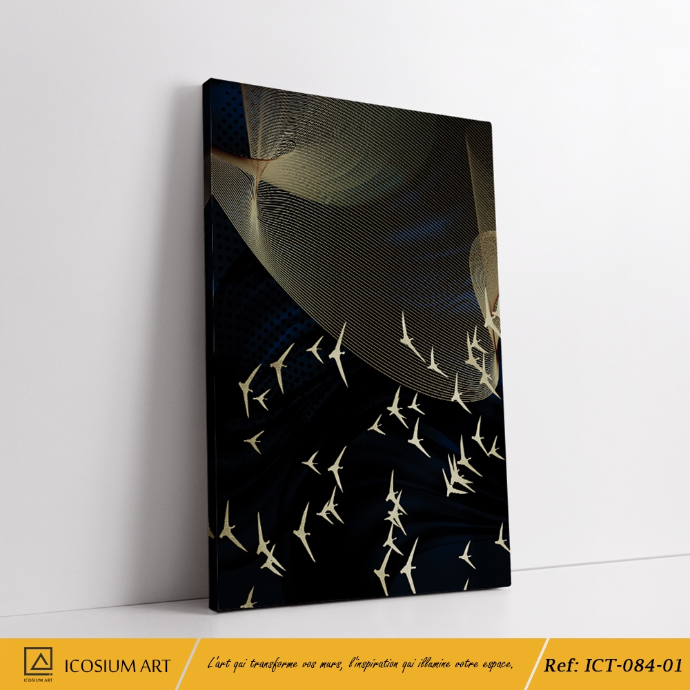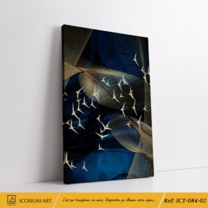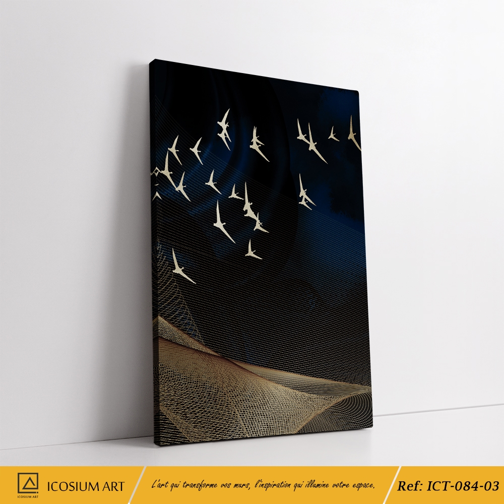Trio décoratif élégent – oiseaux dorés, fond bleu foncé & de doré, lignes ondulantes