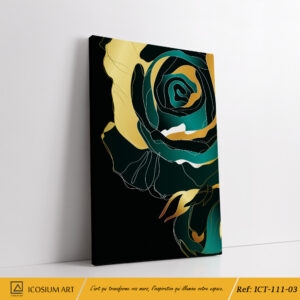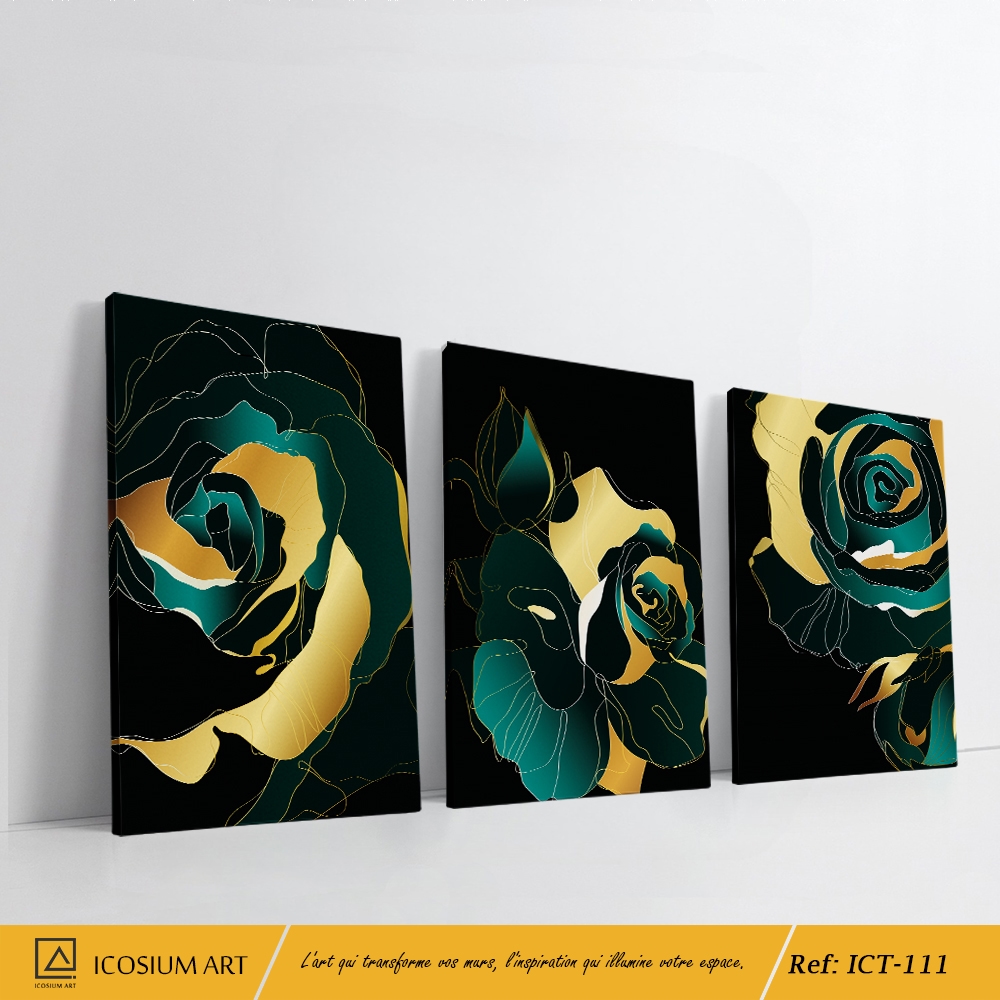 Trio décoratif élégent – roses abstraites aux pétales verts foncés & dorés, fond noir