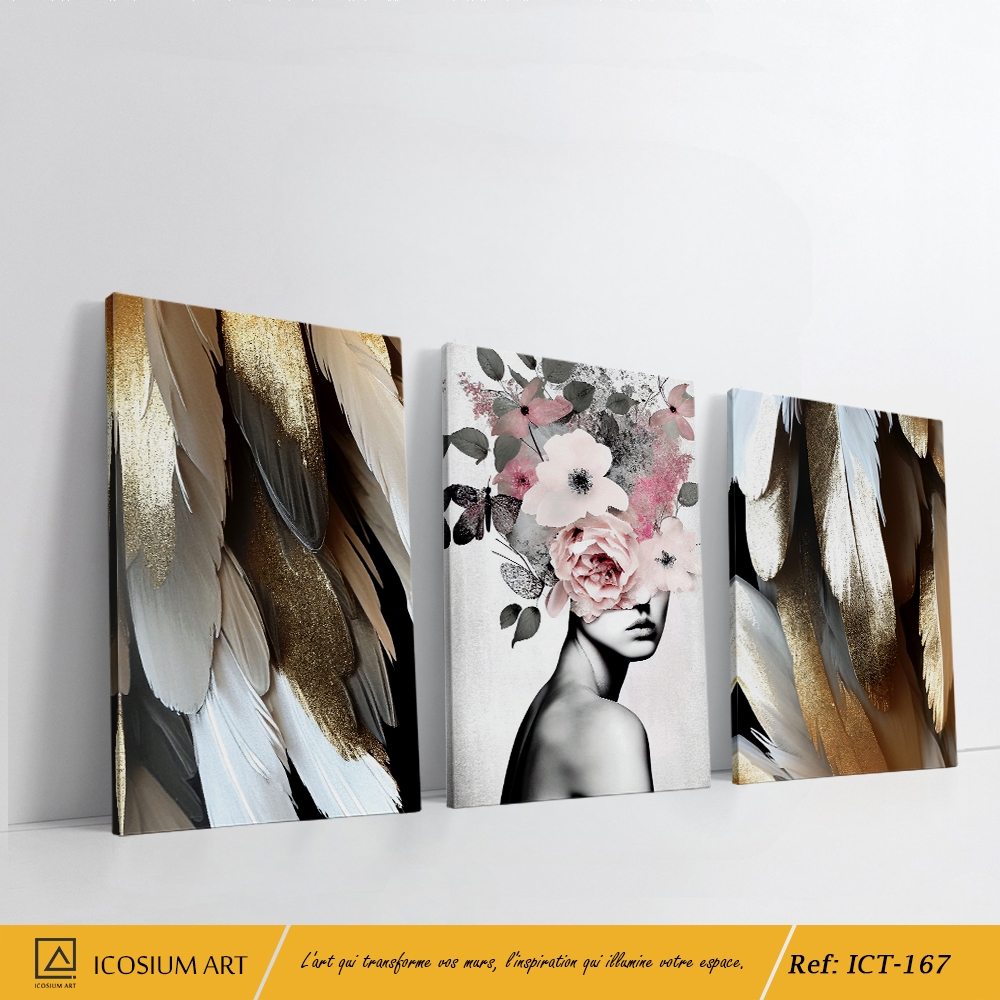 Triptyque Élégance Florale & Ailes Dorées : Harmonie, Grâce et Liberté